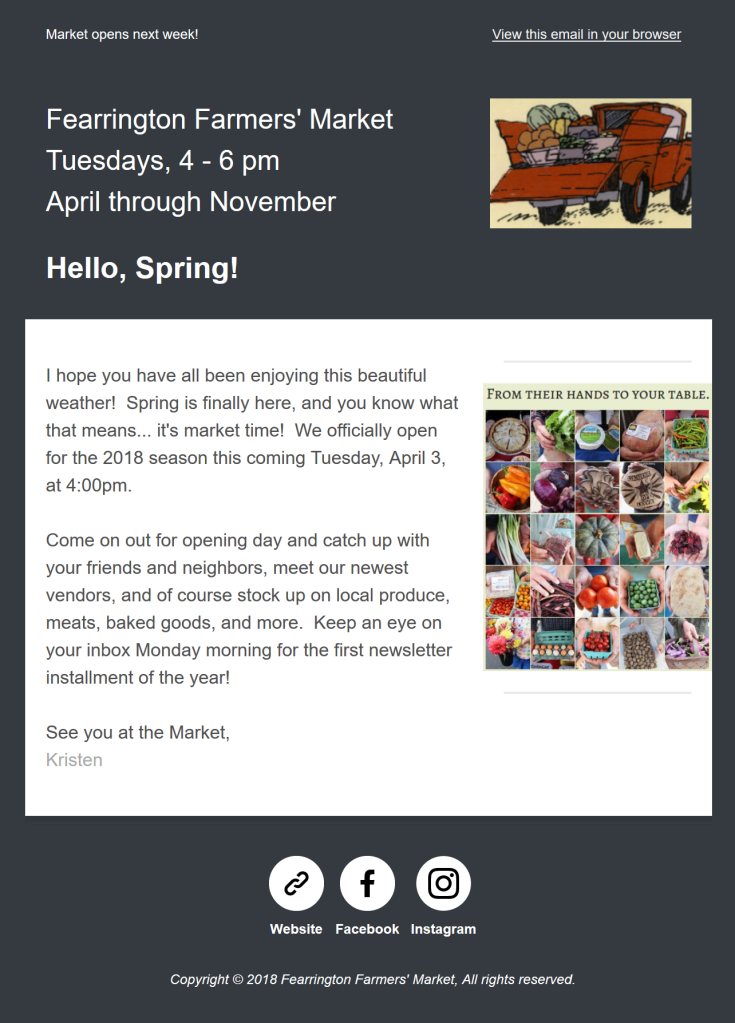 Posted on March 28, 2018April 9, 2018 2018 Market Season Opens April 3! Scroll down to see more content